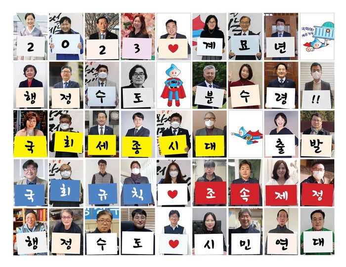 퍼포먼스에는 홍성국·강준현 국회의원, 최교진 교육감, 상병헌 시의회 의장, 안신일 시의원, 효림스님 등 공동대표단과 운영진, 임승달·윤대근 국회 세종의사당 동지회 회장과 김지혜 위원장, 이상선 지방분권 충남연대 상임대표, 김동일·서봉균 행정수도완성 공주포럼 임원진, 이은영 주민생계조합장 등 42명이 참여해 행정수도 완성에 동참하는 세종시 민관정 및 충청권 시민사회가 연대와 공조를 상징화했다.
