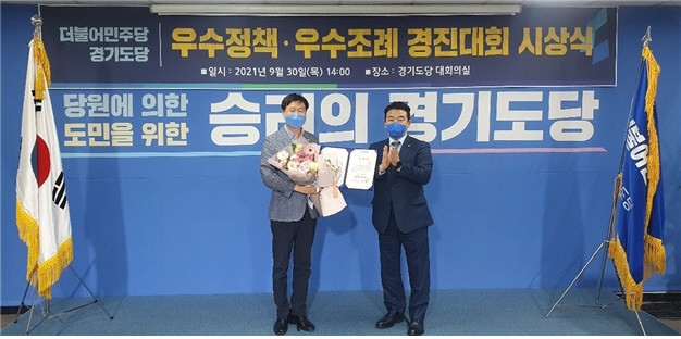 | ▲ 민주당 경기도당 박정 위원장으로부터 수상을 받는 김태희 시의원. |