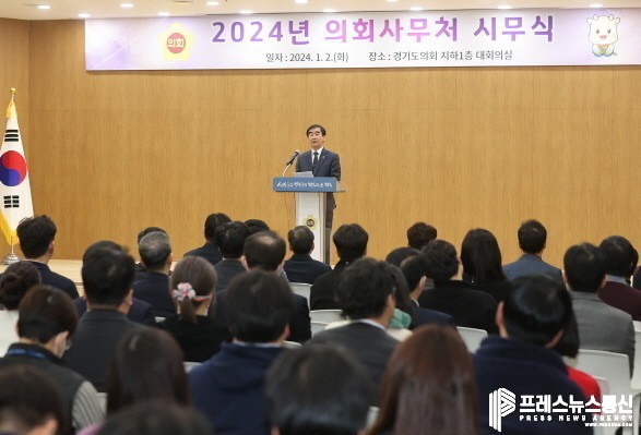 | ▲ 염종현 경기도의회 의장이 2일 의회 대회의실에서 열린 ‘2024년 의회사무처 시무식’에서 신년사를 하고 있다.(사진=경기도의회) |