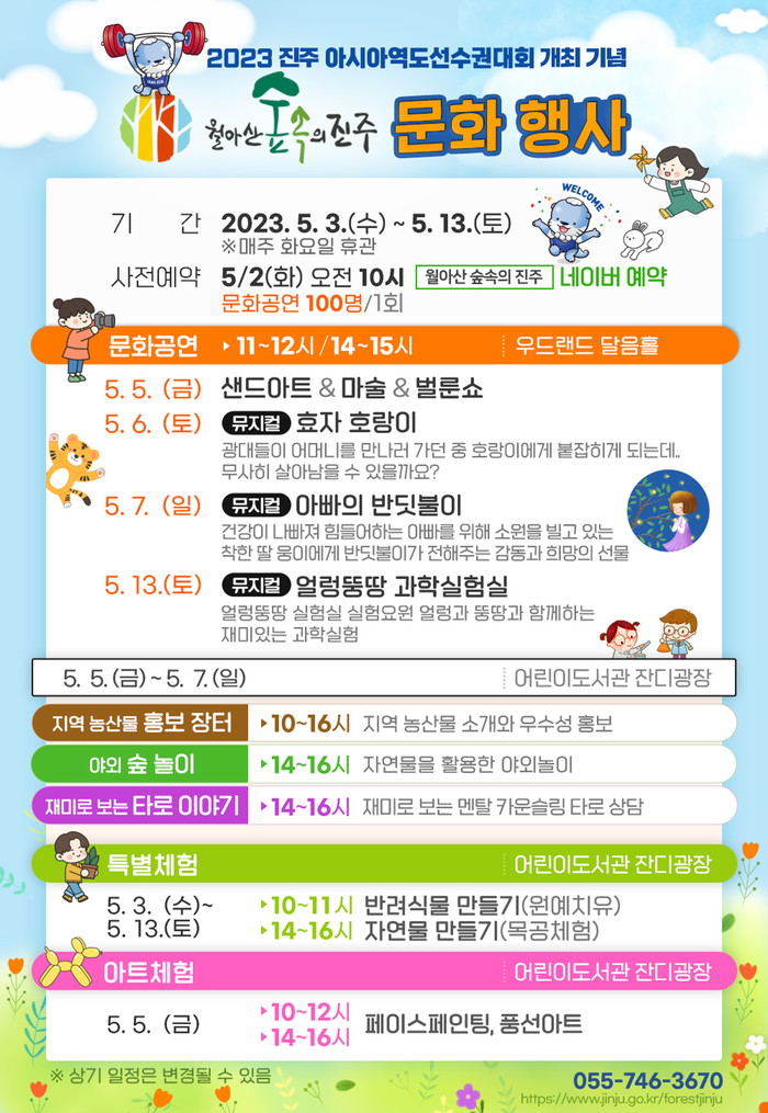 시 관계자는 “2023 진주아시아역도선수권대회의 성공적인 개최를 기원하며 대회기간 동안 월아산 숲속의 진주에서 문화행사를 운영한다”며 “시민 여러분들께서도 같은 마음으로 대회 관람과 문화행사에 많이 참여해 주셨으면 좋겠다”고 당부했다.