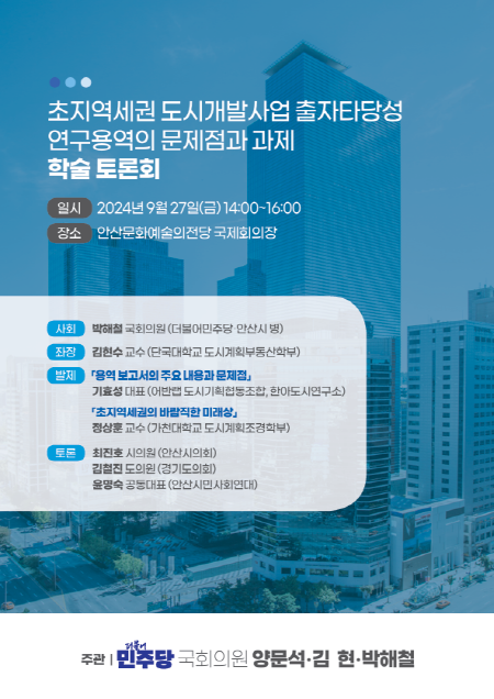 [프레스뉴스] 류현주 기자= 더불어민주당 안산시 국회의원 양문석·김현·박해철 국회의원이 오는 9월 27일 오후 2시에 안산문화예술의전당 국제회의장에서 초지역세권 도시개발사업 출자타당성 연구용역의 문제점과 과제 학술토론회를 진행한다.