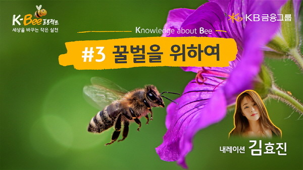 KB금융은 꿀벌 생태계 회복을 통한 생물다양성 보존을 위해 작년부터 전개하고 있는 ‘K-Bee 프로젝트’의 일환으로 ‘한국 알림이’ 서경덕 성신여대 교수와 함께 이번 영상을 제작했다. 금번 영상은 지난해 ‘환경의 날(6월 5일)’에 공개한 ‘꿀벌의 경고’와 ‘농업인의 날(11월 11일)’에 공개한 ‘꿀벌의 선물’에 이은 세 번째 영상으로, 평소 환경 보호에 앞장서며 선한 영향력을 전파하고 있는 배우 김효진이 ‘꿀벌의 경고’ 영상에 이어 다시 한 번 재능기부 형태로 내레이션에 참여했다.