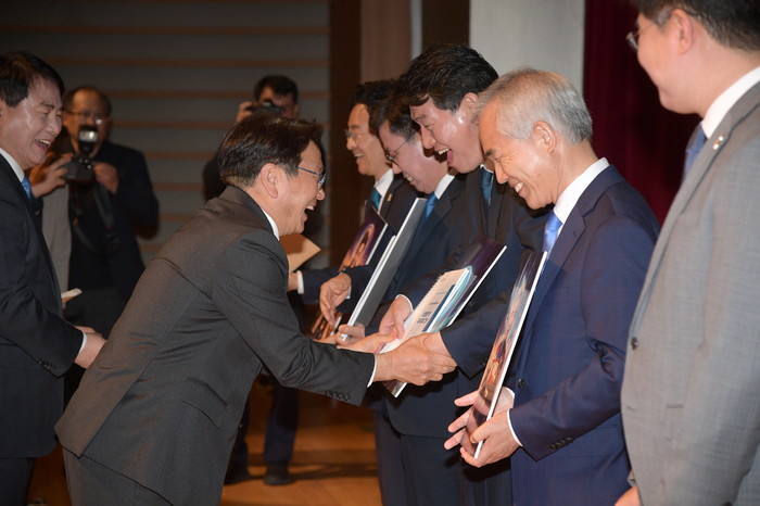 | ▲강기정 광주광역시장이 25일 오전 시청 대회의실에서 열린 제22대 국회의원 당선인 초청행사에 참석해 당선인들에게 시정현안자료를 전달하고 있다. /광주광역시 제공 |