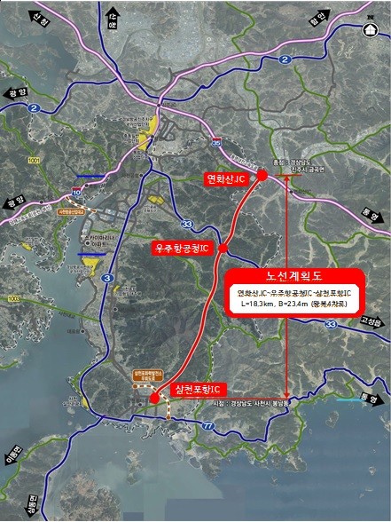 사천우주항공 고속국도는 총사업비 1조 3954억 원, 연장 18.3km의 왕복 4차선 규모로 추진되는데, 연화산JC에서 삼천포항IC를 연결하는 100% 국비 사업이다.
