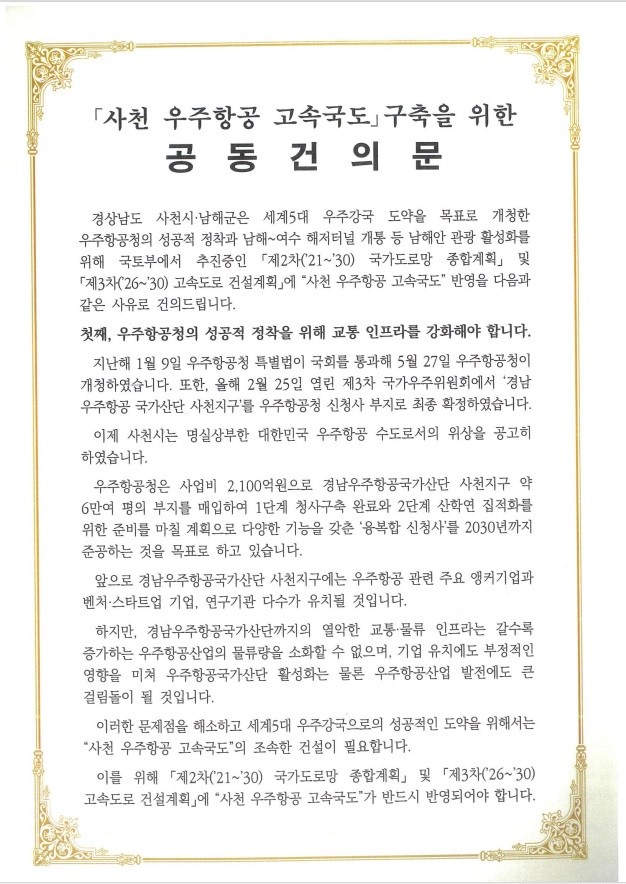 박동식 사천시장과 장충남 남해군수는 31일 ‘사천우주항공 고속국도’를 국토교통부에서 추진 중인 제2차 국가도로망 종합계획 및 제3차 고속도로 건설계획에 반영시켜 줄 것을 요구하는 공동 건의문을 체결했다.