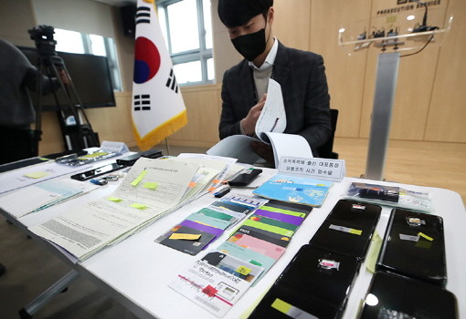 | ▲서울동부지검에 보이스피싱 범죄 합동수사단이 보이스피싱 조직이 범죄에 사용한 대포통장과 카드, 스마트폰 등을 공개했다. (사진= 뉴스1) |