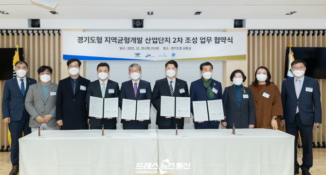 이한규 행정2부지사와 윤화섭 안산시장, 심창보 포천시 부시장, 장기진 경기주택도시공사(GH) 경제진흥본부장은 30일 경기도청 상황실에서 이 같은 내용의 ‘경기도형 지역균형개발 산업단지 2차 조성사업 업무협약’에 서명했다.