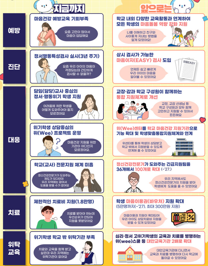 이와 함께, 학생들이 도움이 필요할 때 상담을 받을 수 있도록 학교에 전문상담교사 배치를 확대하고, 학교폭력 대응 중심이던 ‘위(Wee)’ 센터의 기능을 학생 마음건강전담 지원기관으로 확대·개편한다.