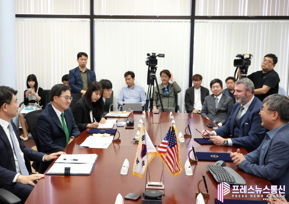 프리미엄아울렛 투자유치에 앞서 김 지사는 같은 장소에서 ㈜코스모이엔지 양기일 대표, 마이클 론델리 미국 노스텍사스대 처장, 최원봉 미국 노스텍사스대 교수, ㈜엠피에스 LA 박정민 지사장과 함께 ㈜코스모이엔지와 2차전지 신소재 생산·연구시설 설립에 따른 투자협약을 체결했다.