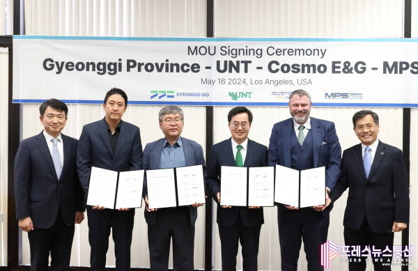 | ▲현지시각 16일 오후 2차전지 신소재 생산ㆍ연구시설 설립에 따른 투자협력을 위해 로스앤젤레스를 방문한 김동연 경기도지사가 마이클 론델리 노스텍사스대학교 처장, 최원봉 노스텍사스대 교수, 양기일 코스모이엔지 대표이사, 박정민 엠피에스 LA지사장과 협약서에 서명하고 기념촬영을 하고 있다.(사진=경기도) |