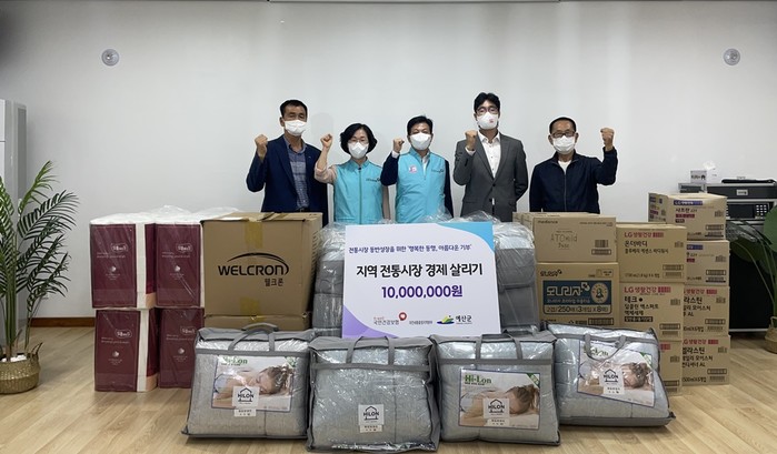 ▲ 국민건강보험공단 대전세종충청지역본부가 지난 27일 예산 상설시장에서 1000만원 상당의 물품을 구입해 예산군 아름다운 집 등 사회복지시설 3곳에 전달했다(사진=대전세종충청지역본부) |