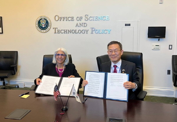 ▲ 이종호 과학기술정보통신부 장관과 아라티 프라바카 백악관 과학기술정책실 실장이 미국 현지시간 25일 11시 백악관에서 한-미 양자과학기술 협력 공동성명서에 서명했다. (사진=과학기술정보통신부) |