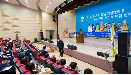 ▲한국노총 광주지역본부가 지난달 28일 개최한 노동절 기념대회에서 이정선 광주교육감 예비후보가 인사를 하고 있다./이정선 선거캠프 제공 |