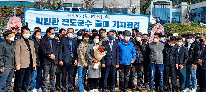 ▲박인환 전 국민소통특별위원회 위원이 22일 진도군청 앞에서 기자회견을 열고 진도군수 출마를 공식 선언 했다. (사진제공=박인환사무실) |