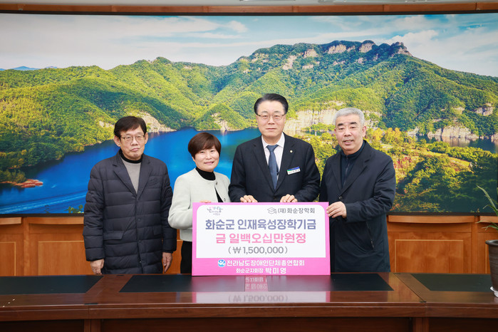 [전남=프레스뉴스] 박정철 기자=(재)화순장학회(이사장 : 구복규 화순군수)는 지난 4일 전라남도장애인단체총연합회 화순군지회가 지역 학생들의 학업을 지원하기 위해 장학금 150만 원을 기부했다고 밝혔다.