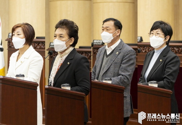 | ▲ 안산시의회가 21일 제282회 임시회 제1차 본회의를 개최했다. 사진 왼쪽부터 이날 본회의에서 5분 자유발언을 실시한 현옥순 이진분 박태순 박은경 의원의 모습.(사진=안산시의회) |
