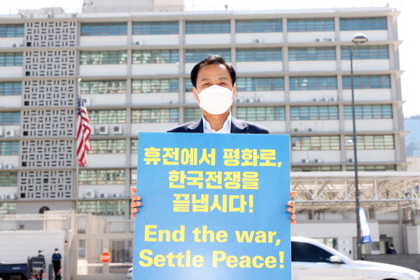 장현국 의장은 21일 서울 주미대사관 맞은편 광화문 광장에서 실시 중인 시위 현장을 방문해 ‘휴전에서 평화로, 한국전쟁을 끝냅시다!(End the war, Settle Peace!)’라는 문구가 담긴 팻말을 들고 1인 시위에 동참했다.