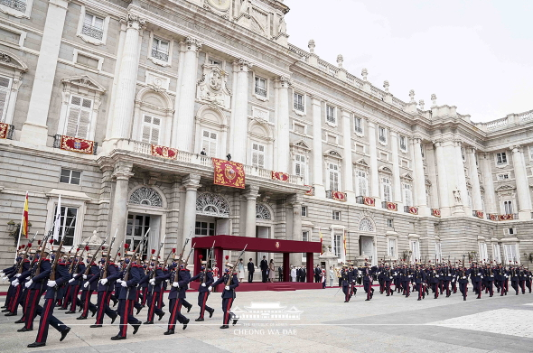 마드리드 왕궁 ‘팔라시오 레알’(Palacio Real)에서 진행된 공식환영식에서 문 대통령 부부가 탄 차량은 팔라시오 레알로 들어와 도열한 300여명의 군악대와 의장대를 통과해 멈췄고, 차 앞까지 마중을 나온 펠리페 6세 국왕 부부는 반갑게 인사를 건넸다.