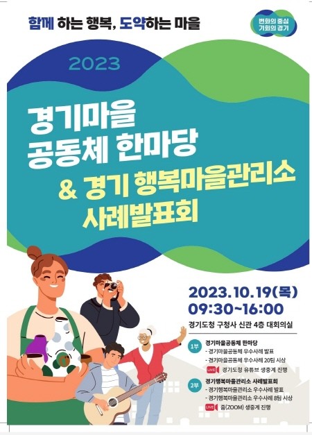 [프레스뉴스] 장현준 기자= 경기도가 오는 19일 수원시 팔달구 옛 경기도청사 신관에서 마을공동체 활동가와 행복마을관리소 지킴이들이 한자리에 모여 소통하는 ‘2023 경기마을공동체 한마당 & 경기 행복마을관리소 사례발표회’를 개최한다.