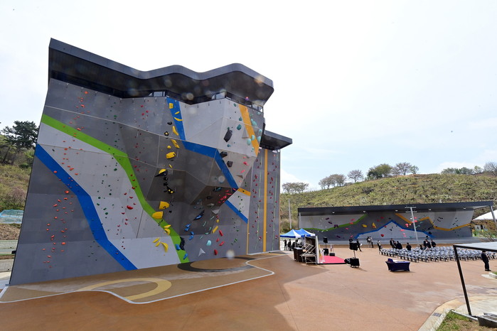 모덕암벽장은 늘어나는 스포츠클라이밍 수요에 대응하고 생활체육 저변 확대를 위해 총사업비 42억 원을 투입해 부지면적 3,622㎡ 규모로 조성됐다. 경남 최대 규모로, ▲폭 24m·높이 15.7m의 리드월 ▲폭 6m·높이 15.7m의 스피드월 ▲폭 33m·높이 5m의 볼더링월을 비롯해 실내·외 몸풀기 벽 등으로 구성됐다.