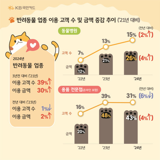특히 60대 이상의 반려동물 용품 이용 금액은 77%, 동물병원은 57% 증가해 고령층이 삶의 동반자로 인식하고 적극적인 소비에 나서고 있는 흐름으로 해석된다.