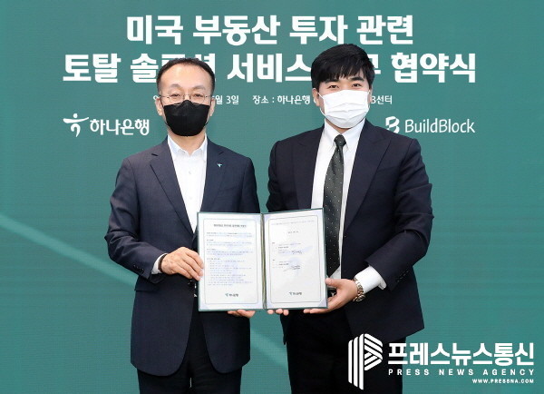 [프레스뉴스] 김대일 기자= 하나은행(은행장 박성호)은 서울 한남동 소재 Club1한남PB센터에서 미국 부동산 투자 플랫폼 기업인 ㈜빌드블록(대표 정지원)과 미국 부동산 투자 관련 토탈 솔루션 서비스 제공을 위한 업무협약을 체결했다고 밝혔다.