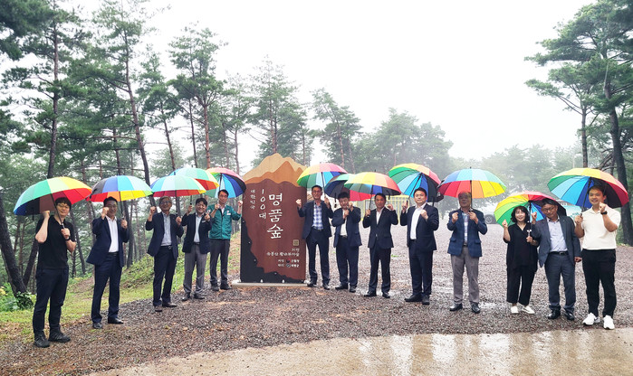 ▲의령군산림조합은 지난 20일 대한민국 100대 명품숲에 선정된 ‘의령 응봉산 황금 부자숲’에서 기념 입간판 제막식을 열었다 (사진=의령군) |