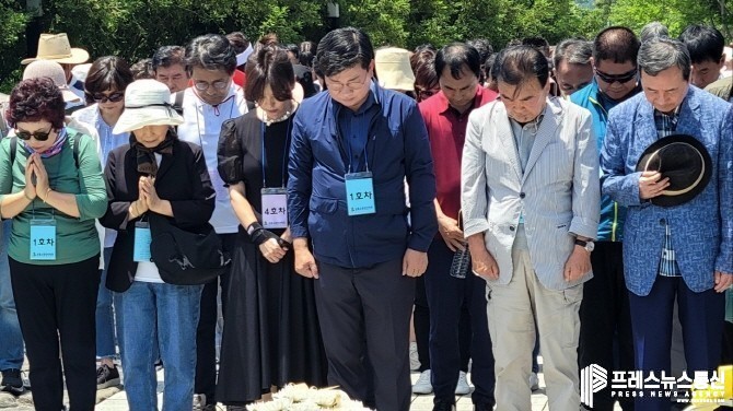 | ▲ 지난 17일 전해철 의원과 안산 상록갑 지역 주민들이 봉하마을을 찾아 노무현 대통령 묘역에 참배하고 있다.(사진=전해철 의원실) |