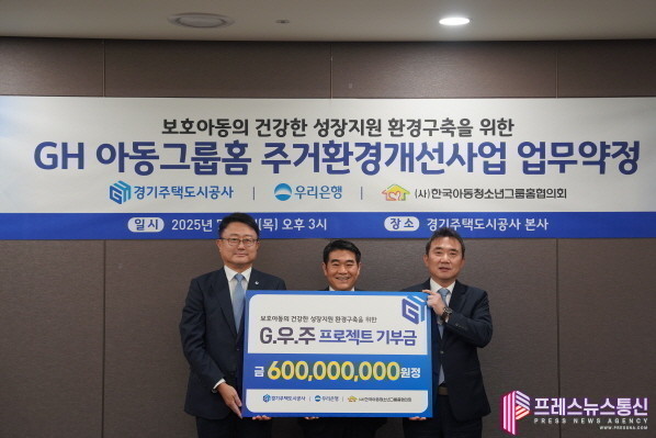 [프레스뉴스] 류현주 기자= 경기주택도시공사(GH)는 수원 본사에서 우리은행, 한국아동청소년그룹홈협의회와 함께 ‘아동그룹홈 주거환경 개선사업’ 업무협약을 체결했다고 3일 밝혔다. 이번 협약에 따라 ‘G.우.주 프로젝트(GH + 우리은행 아동그룹홈 주거환경 개선사업)’가 본격 착수된다.