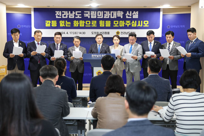[전남=프레스뉴스] 강래성 기자= 전남도의회가 도민의 30년 숙원인 전남 국립의대 신설을 위해 지역 간 과도한 경쟁을 자제하고 갈등 없는 화합으로 힘을 모아달라고 호소했다.