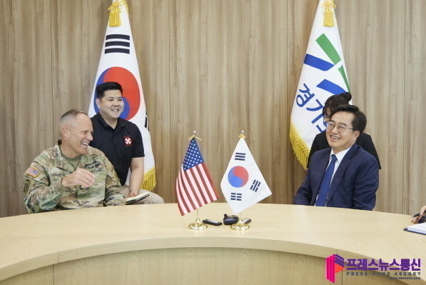 | ▲17일 오후 경기도지사 집무실에서 김동연 경기도지사와 크리스토퍼 라니브(Christopher LaNeve) 신임 미8군사령관이 면담을 하고 있다.(사진=경기도) |