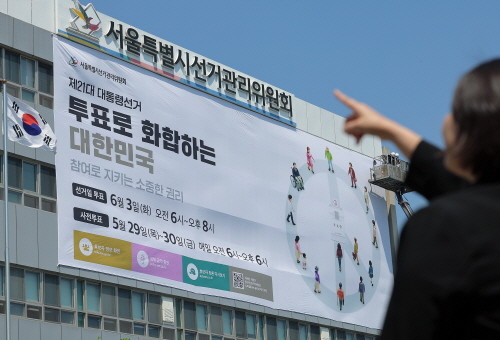 ▲29일 서울 종로구 서울시선거관리위원회 외벽에 관계자들이 제21대 대통령 선거 대형 홍보 현수막을 게시하고 있다.(사진= 뉴스1) |