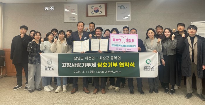 이번 협약을 통해 고향사랑기부제 활성화 건전한 기부문화 확산을 위해 상호 협력하기로 뜻을 모았으며, 담양군 대전면 직원과 화순군 동복면 직원 15명이 각 지자체에 10만 원씩 총 300만 원을 기부하며 지역 발전을 응원했다.