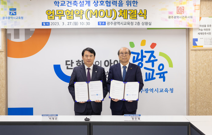 [광주=프레스뉴스] 강래성 기자= 광주시교육청이 27일 학교건축설계에 내실화를 기하고자 광주건축사회와 ‘학교건축설계 상호협력을 위한 업무협약을 체결했다.