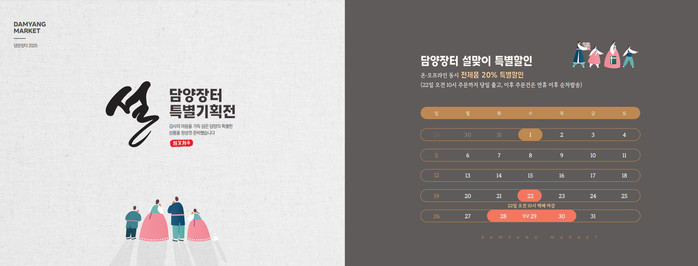 을사년을 기념해 담양쌀·딸기·한우·한과·참기름 등 전 품목을 20% 할인하며 오프라인 직매장(담양군 담양읍 면앙정로 730)과 온라인 쇼핑몰(www.damyangmk.kr)에서 동시에 진행한다.