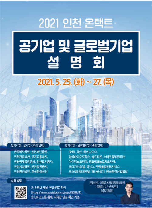 인천광역시는 시와 중부지방고용노동청, 인하대, 인천대가 공동 개최하는‘2021 인천 온택트 공기업 및 글로벌기업 설명회’가 5월 25일부터 5월 27일까지 사흘간 유튜브(인크루트)에서 송출된다고 밝혔다.