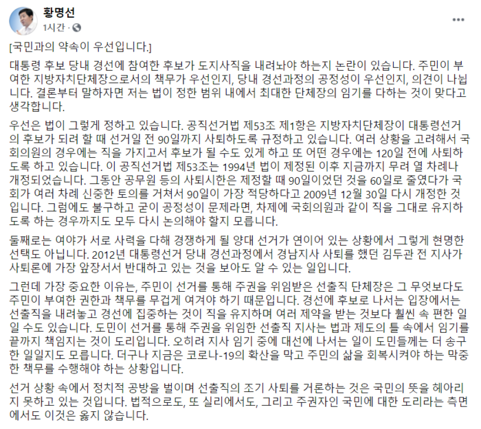 [프레스뉴스] 강보선 기자= 황명선 전국시장군수구청장협의회 회장이 최근 논란이 되고 있는 이재명 후보의 도지사직 시퇴와 관련하여 페이스북에 의견을 피력했다.
