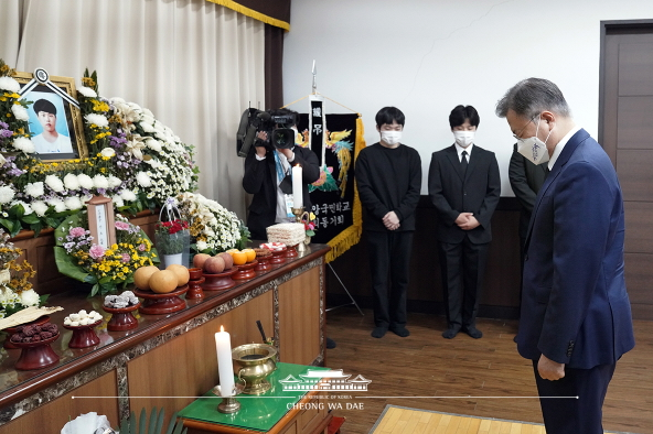 [프레스뉴스] 강보선 기자= 문재인 대통령은 13일 오후 평택항에서 일하다 산재사고로 숨진 故 이선호 씨의 빈소를 찾아 유가족을 위로했다.