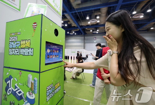 ▲지난 5일 서울 강남구 코엑스에서 열린 2025 강남구 행복 일자리 박람회를 찾은 관람객이 희망직업과 미래모습을 AI기술을 이용해 사진 찍고 있다.(사진= 뉴스1) |