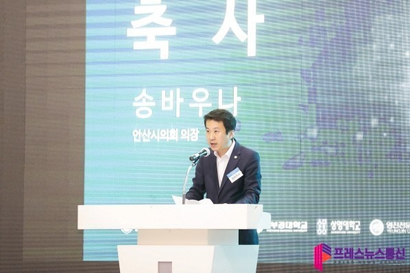| ▲ 안산시의회 송바우나 의장이 8일 한양대학교 ERICA 캠퍼스 게스트하우스에서 열린 ‘2023년 88로봇데이’개막식에서 축사를 하고 있다.(사진=안산시의회) |