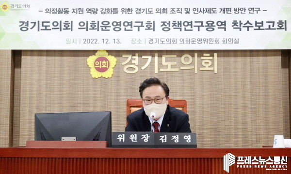 [프레스뉴스] 김대일 기자= 경기도의회 의회운영연구회(회장 김정영 위원장, 국민의힘 의정부1)는 지난 13일(화) 의회운영위원회 회의실에서 ‘지방의회 인사권 독립 이후 의정활동 지원 역량 강화를 위한 경기도의회 조직 및 인사제도 개편 방안 연구’ 착수보고회를 개최했다.