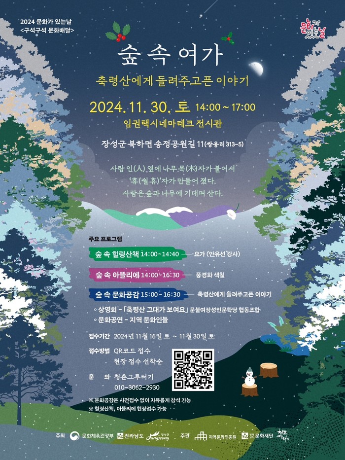 한편, ‘숲속여가’가 열리는 임권택시네마테크는 장성 출신의 세계적인 거장 임권택 영화감독을 기념하는 공간이다. 군은 임권택시네마테크를 비롯한 장성호관광지 일원을 사계절 관광지로 재탄생시키는 ‘장성 원더랜드 프로젝트’를 전라남도에 제안해 ‘전남형 균형발전 300 프로젝트 공모’에 최종 선정됐다.
