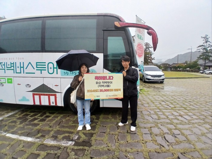 이날 영예의 주인공은 경기도 성남시 분당구에서 화순적벽을 찾아온 이복순 씨로 뜻밖의 행운을 잡은 2만 번째 관람객에게는 화순적벽버스투어 홍보물인 트레블파우치, 트레블세면키트, 보냉백 등의 상품이 증정됐다.