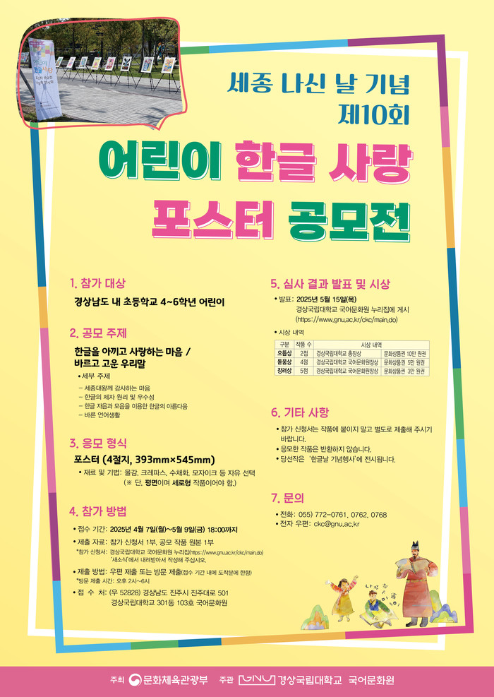 ▲경상국립대학교(GNU·총장 권진회) 국어문화원(원장 정영훈)은 제628돌 세종 나신 날(5월 15일) 을 맞아 ‘제10회 어린이 한글 사랑 포스터 공모전’을 개최한다고 밝혔다. (사진=경상국립대) |