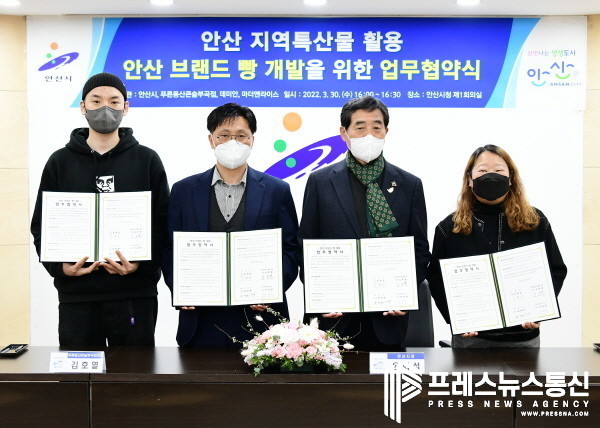 [프레스뉴스] 장현준 기자= 안산시(시장 윤화섭)는 30일 시청 제1회의실에서 푸른동산큰숲 부곡점, 데미안, 마더앤라이스 등 관내 제과점과 대부도 포도, 김 등 지역특산물을 활용한 ‘안산 브랜드 빵’ 개발을 위한 업무협약을 체결했다.