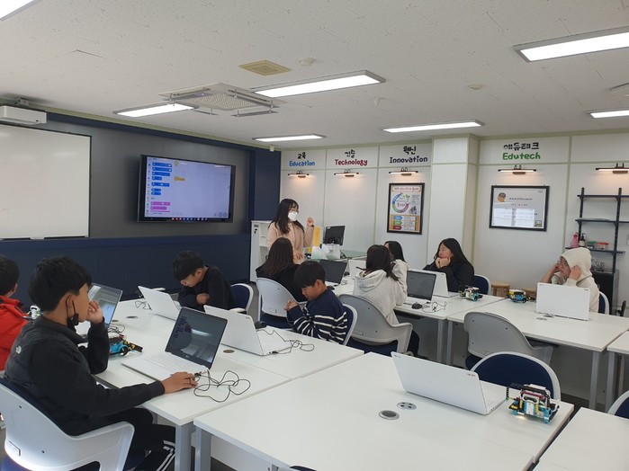 초등학교 5학년은 BASIC 과정으로 햄스터봇을 이용한 코딩 기초 프로그램을, 6학년은 SMART 과정으로 카미봇 파이와 티쳐블머신을 활용한 AI데이터 활용 코딩 프로그램을 운영한다.