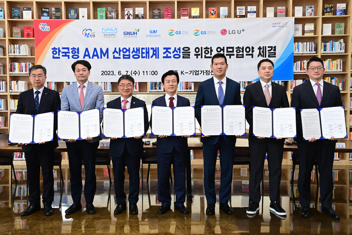 [프레스뉴스] 정재훈 기자= 진주시는 지난 7일 경상국립대학교, 경상국립대학교병원, KAI(한국항공우주산업(주)),GS건설, GS칼텍스, LG유플러스와 한국형 미래항공모빌리티(AAM) 산업생태계 조성을 위한 업무협약을 체결했다.