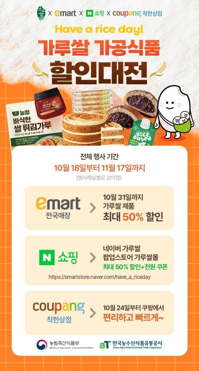 이번 행사는 그동안 출시된 가루쌀 라면, 과자, 음료 등 가공식품에 대해 소비자 경험을 확대하기 위해 마련했으며, 접근성이 좋은 이마트 등 주요 유통채널을 통해 최대 50% 할인한 가격으로 판매한다.