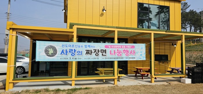 | ▲신안군 지도읍 선도에서 펼쳐진 사랑의 짜장면 나눔 행사/신안군 제공 |