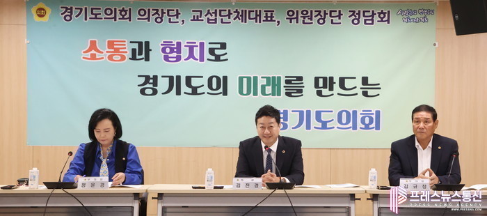 정담회에서 김 의장 등 참석자들은 ▲제68주년 경기도의회 개원기념식 개최 ▲제377회 임시회 의사일정 및 회부안건 ▲경기도의회 의정연수원 설립방안에 관한 연구용역 ▲가칭 경기의정연구원 설립방안 연구용역 등에 대해 의견을 나눴다.